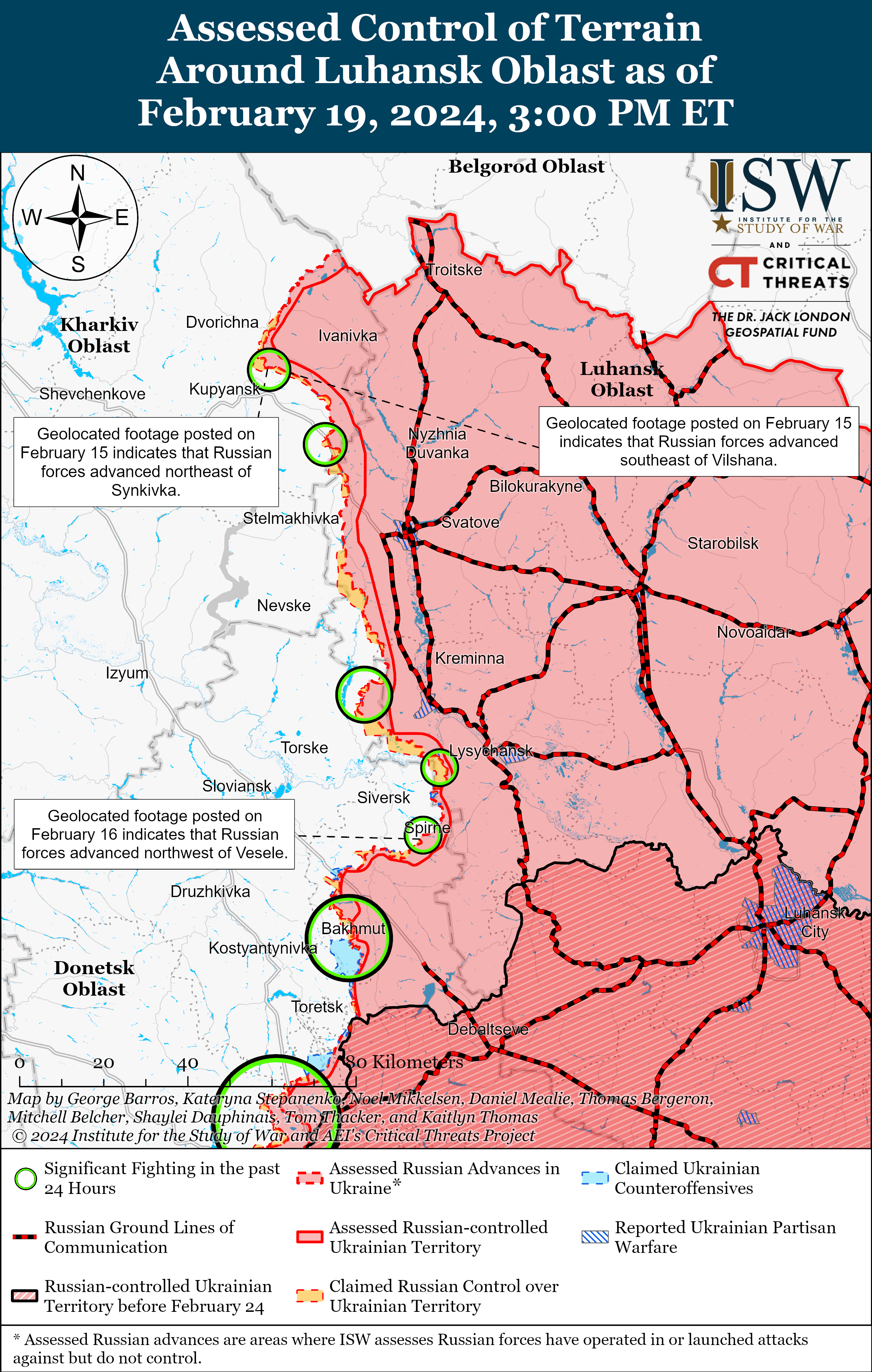 Войска РФ недавно незначительно продвинулись севернее Марьинки (к западу от города Донецк) на фоне продолжающихся позиционных боев к западу и юго-западу от города Донецка 19 февраля. Геолокационные кадры, опубликованные 17 февраля, показывают, что оккупанты недавно незначительно продвинулись к северу от Марьинки.