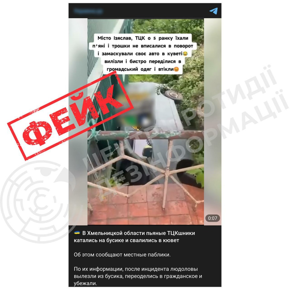 "Вражеские TG-каналы распространяют информацию, что в Изяславе Шепетовского района Хмельницкой области якобы работники ТЦК и СП в состоянии алкогольного опьянения не вписались в поворот и упали в кювет", – говорится в сообщении.