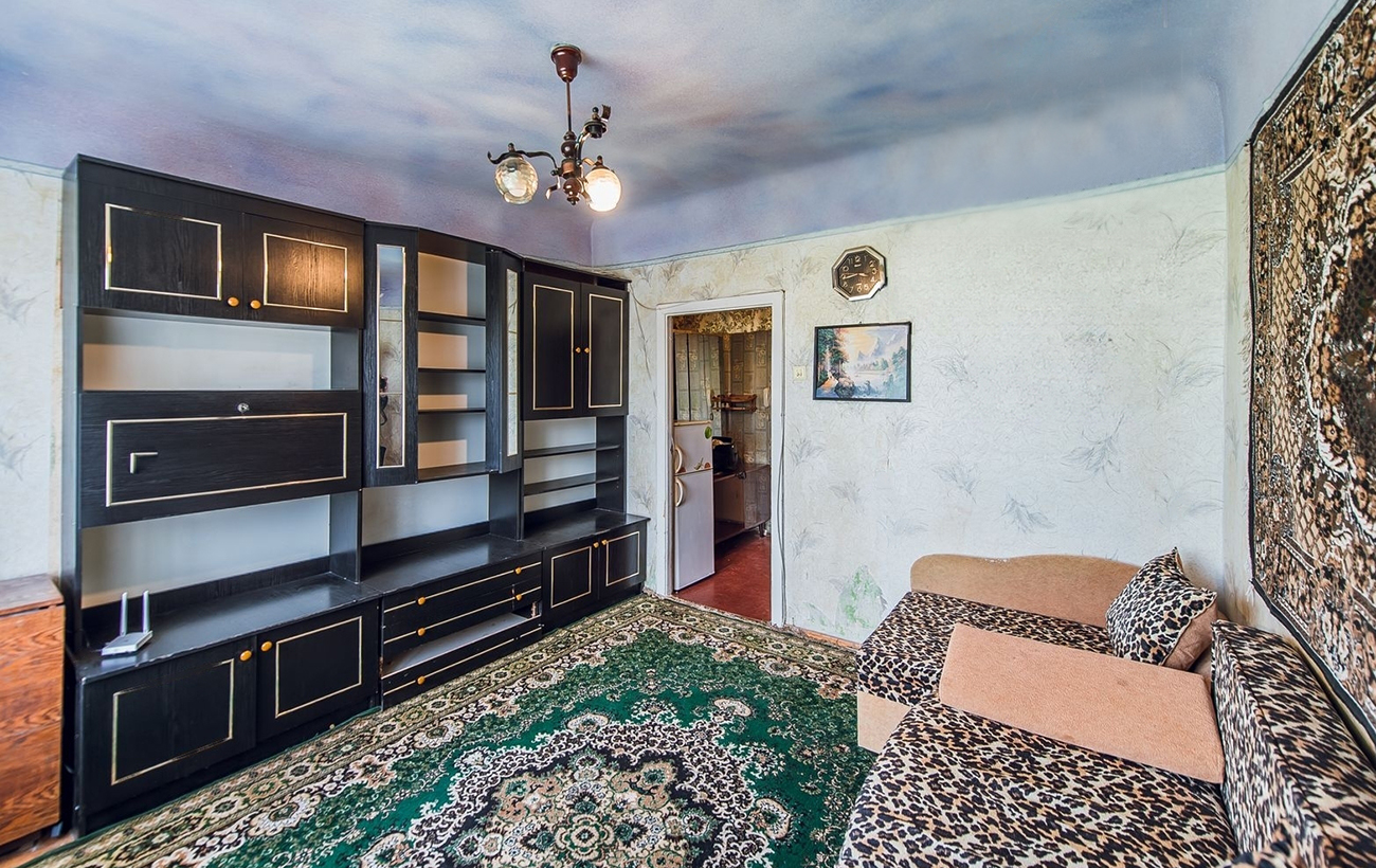 Состояние квартиры описывают как удовлетворительное, хотя по фото видно, что здесь придется производить капитальный ремонт. Пол, обои, двери и многое другое требуют замены. Также в этой квартире – старая мебель советского образца, и ванная и туалет в неудовлетворительном состоянии. Видно, что во многих местах покрытие стен поразил грибок, обои отклеиваются. Не исключено, что сантехника тоже требует замены.