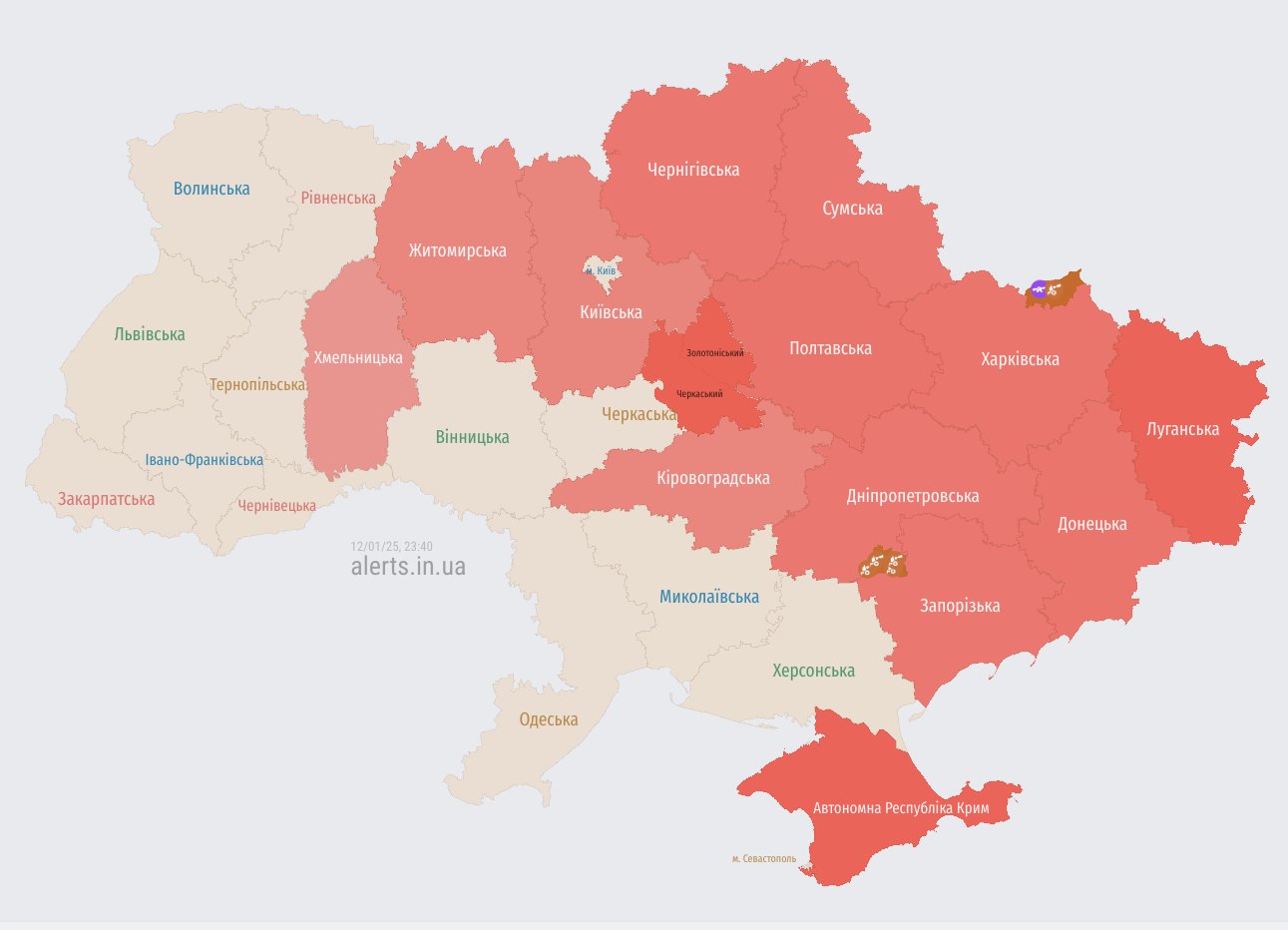 По состоянию на 23:40 карта воздушных тревог Украины выглядела так: