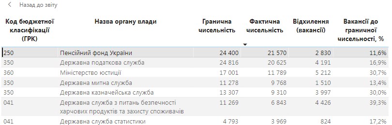 По данным Минфина, наибольшая численность работников была в Пенсионном фонде – 21 570 человек и Государственной налоговой службе – 20 625 человек.
